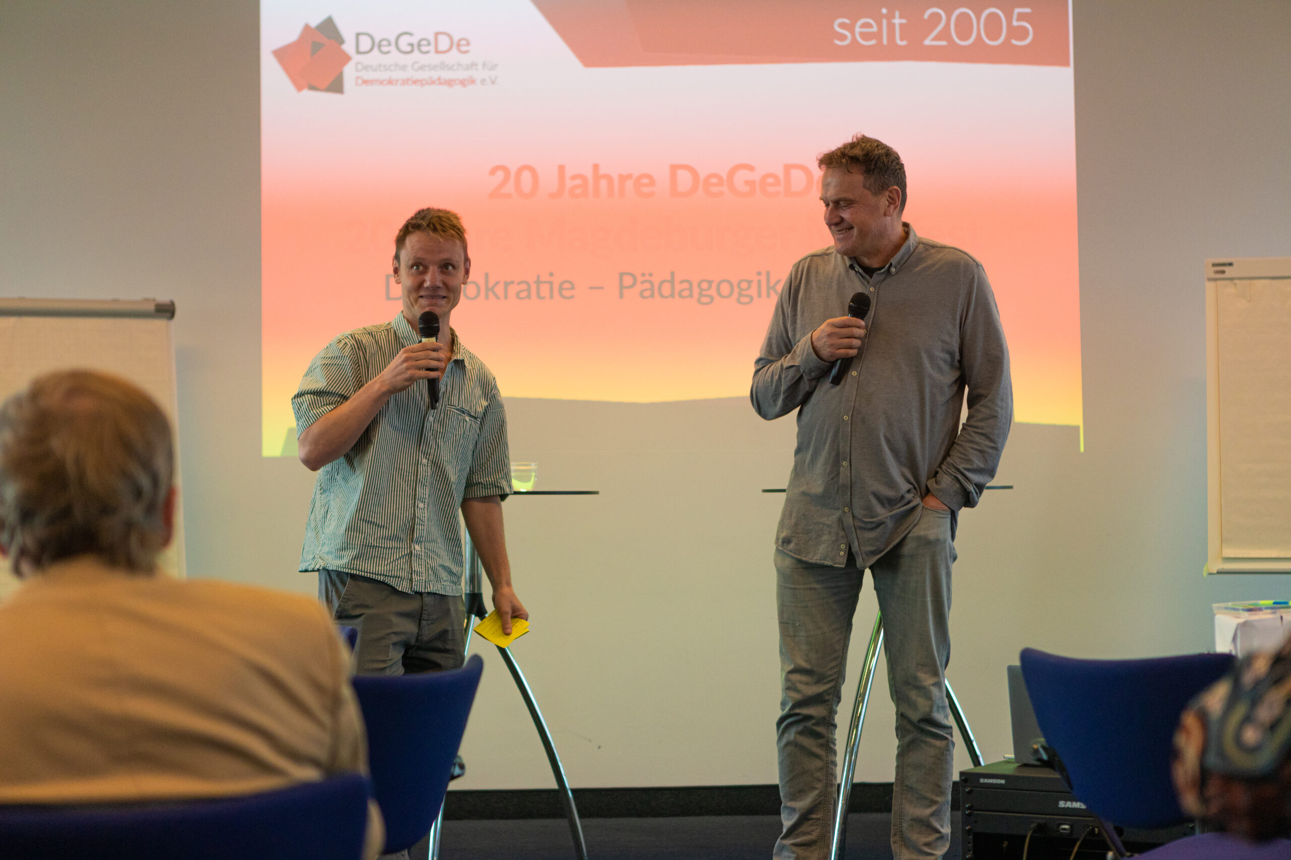 Im Anschluss begrüßten Michael Siegel und Klaas Wolf den Saal im Namen des Bundesvorstands. Mit einem Blick in die Zukunft luden sie alle Anwesenden ein, ihre Wünsche und Visionen für die DeGeDe aufzuschreiben, für eine Zeitkapsel, die die nächsten Jahre begleiten wird.