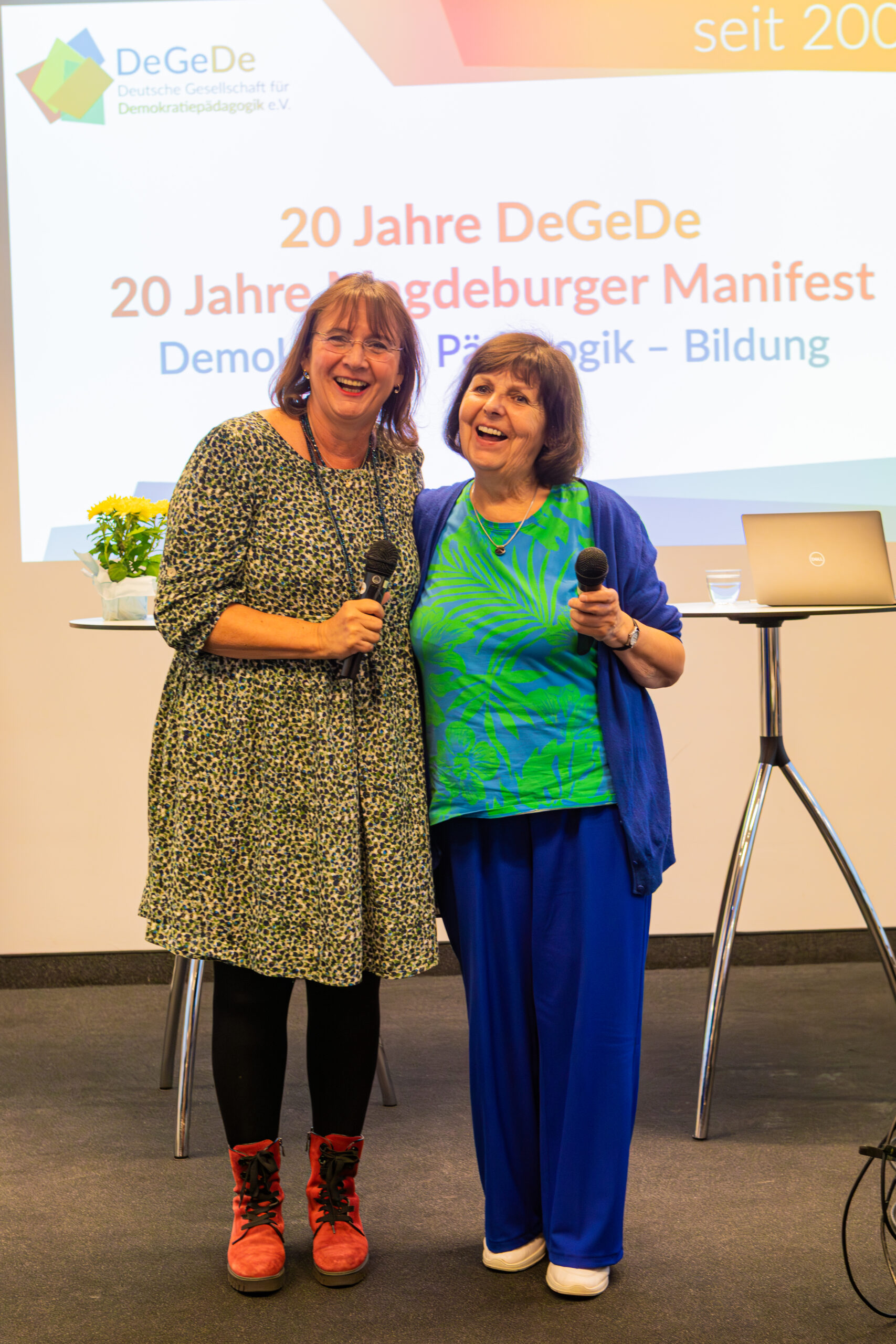 In einem humorvoll nachgestellten Telefonat zwischen Ulrike Kahn und Susanne Ulrich blickten sie auf die Anfänge der Vereinsarbeit und die Entwicklung der DeGeDe zurück. Sie berichteten von Ulrikes Idee zum Jubiläumsfest gemeinsam mit Markus Gloe und spannten den Bogen vom Bundesmodellversuch „Demokratie leben und lernen“ über die Qualifizierung von Pädagog*innen bis hin zur Vereinsgründung in Magdeburg. Ulrike betonte, wie wichtig gelebte demokratische Kultur, Solidarität und die Förderung von Selbstwirksamkeit sind, um Demokratie erfahrbar zu machen. Das Gespräch endete mit ihrem Wunsch nach mehr Sichtbarkeit demokratiepädagogischer Themen, mutigen Vernetzungen und einem Engagement für Frieden sowohl innergesellschaftlich als auch global.