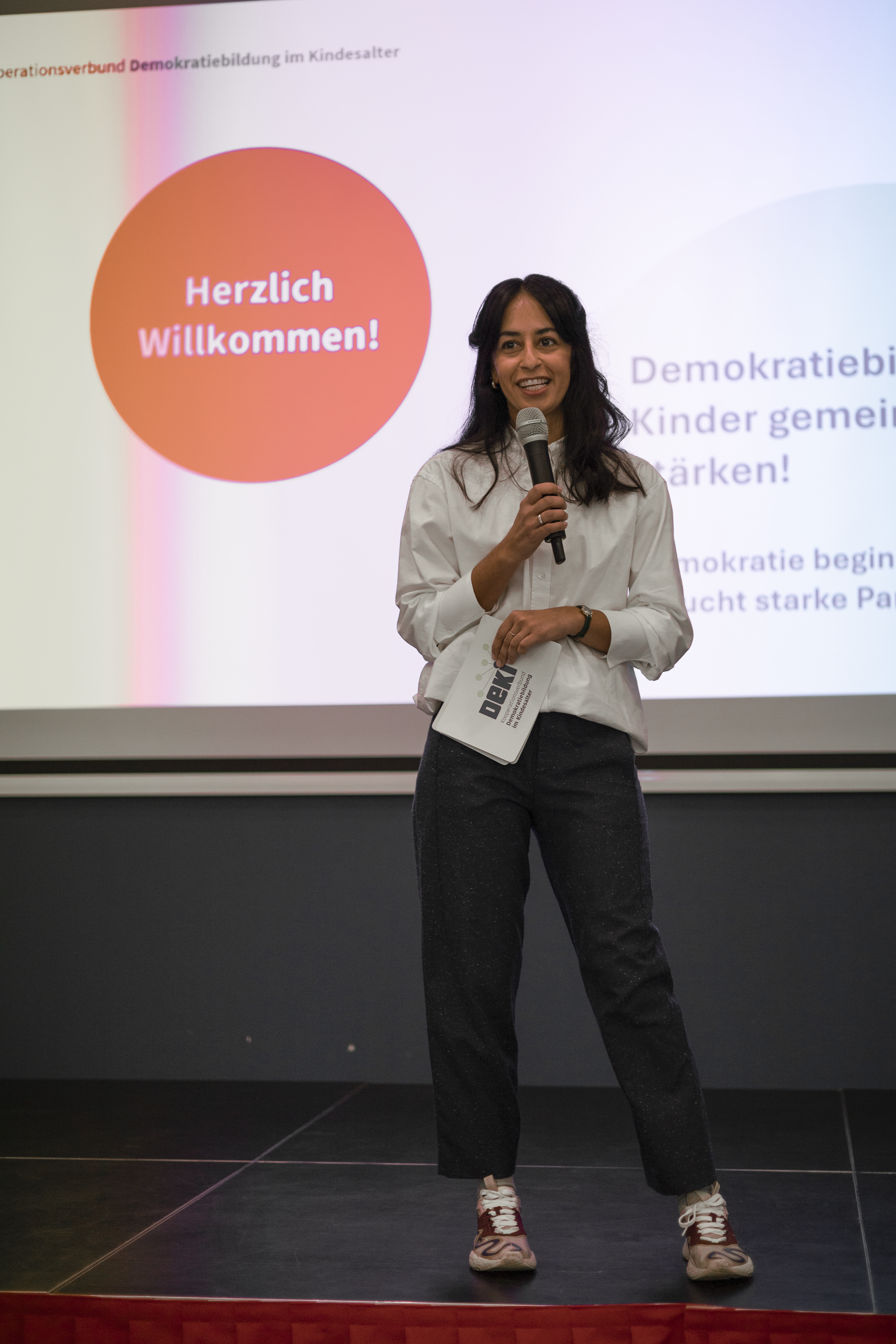 Muschda Sherzada führte als Moderatorin mit viel Charme und Expertise durch die Veranstaltung. Nach einem kurzen digitalen Grußwort der Bundesministerin für Bildung, Familie, Senioren, Frauen und Jugend, Karin Prien, stellte sich der Kooperationsverbund mit seinen Zielen und Partner*innen vor. Dr. Lena Kahle (Geschäftsführung der DeGeDe) sagte sinngemäß „Ich freue mich auf diesen Tag, weil all die Ideen, die wir bisher im kleinen Kreis diskutiert und entwickelt haben, heute endlich mit euch geteilt und gemeinsam mit Leben gefüllt werden können“. Außerdem kamen diejenigen zu Wort, denen wir als KV verpflichtet sind, die Kinder. Hierzu wurden kleine Ausschnitte aus der neuen Videoreihe „Kinderstimmen zu Demokratie“ der Deutschen Kinder- und Jugendstiftung gezeigt.
