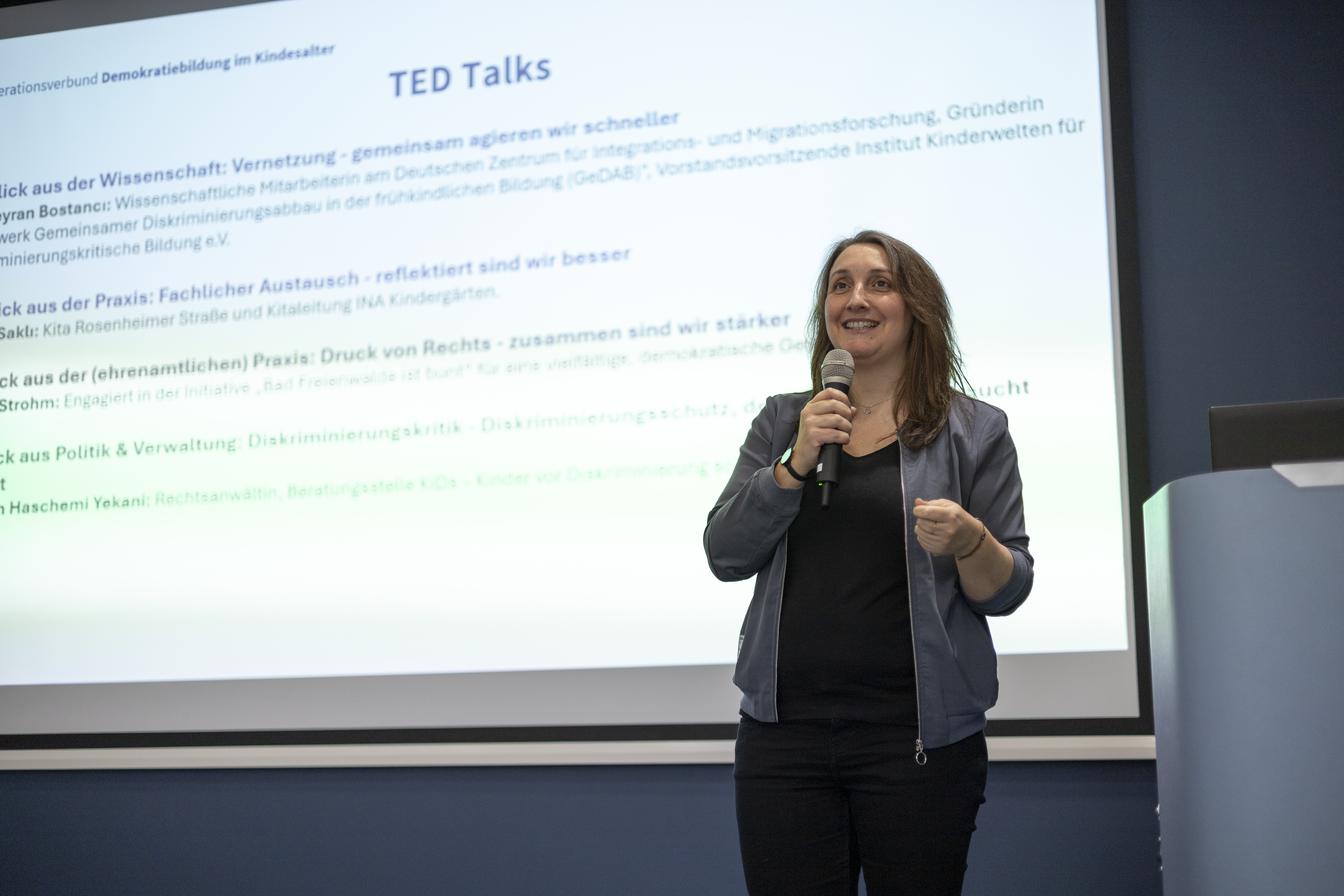 In vier TED-Talks gaben Expert*innen Einblicke in aktuelle Herausforderungen und Lösungsansätze der frühkindlichen Demokratie- und Diskriminierungspädagogik. So berichtete Dr. Seyran Bostancı (Deutsches Zentrum für Integrations- und Migrationsforschung, Gründerin des Netzwerks GeDab) über die Bedeutung von Vernetzung, um Machtverhältnisse im frühkindlichen Bereich gezielt zu bearbeiten. Zudem machte Judith Strom (Initiative „Bad Freienwalde ist bunt“) deutlich, wie wichtig es ist,